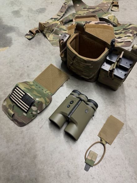 The placard also accepts 2 AICS or 2 20 round 5.56 mags and has snaps built into the bottom to support the weight of the equipment in the placard. This snap system is also built into the backside of The Lunger Chest Rig. The side of the Bino pouch also has a single column of MOLLE for attaching a Kestrel Pouch if desired.